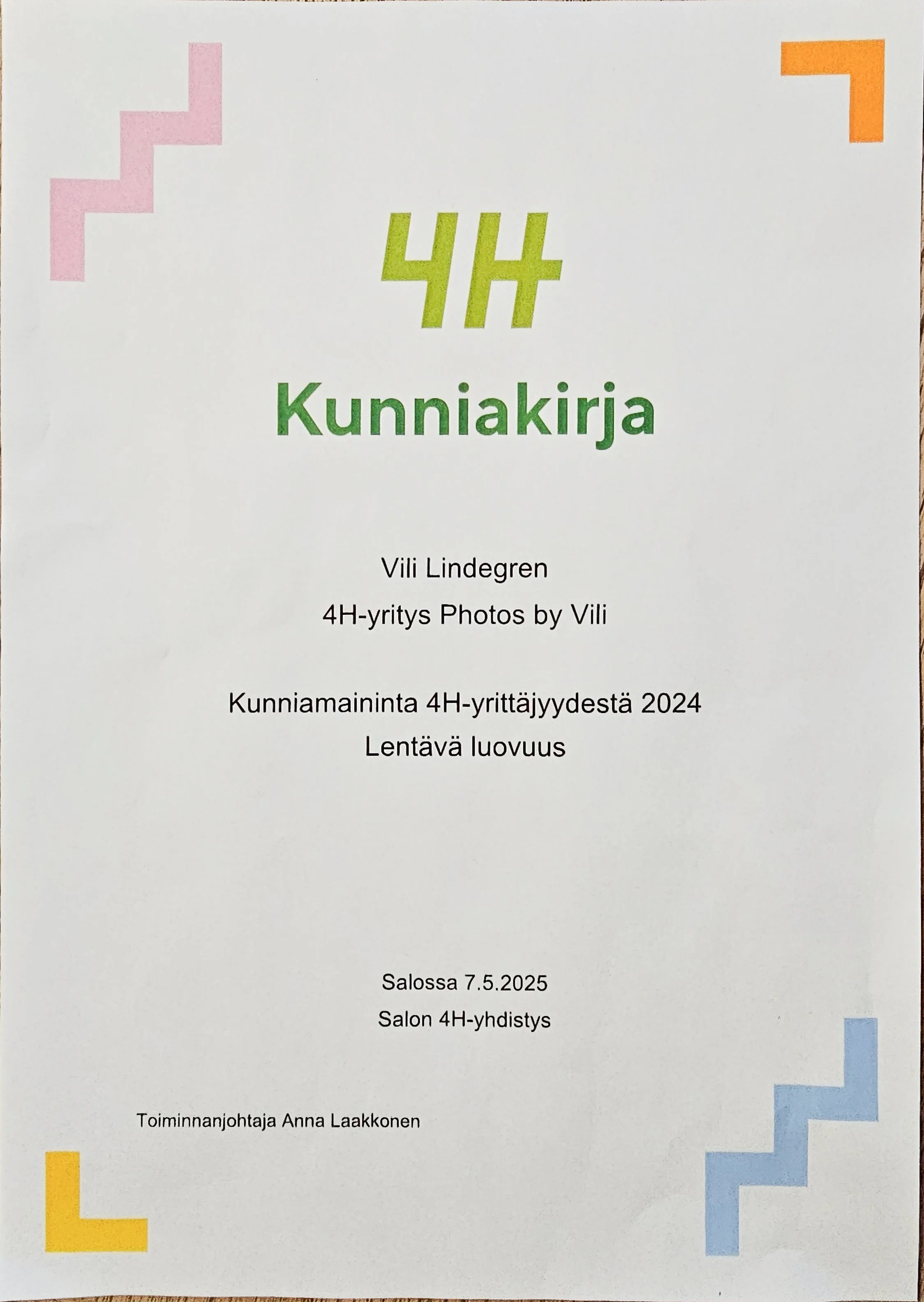 Salon 4H palkitsi mut ansiokkaasta 4H toiminnasta yrittäjyyden saralla.